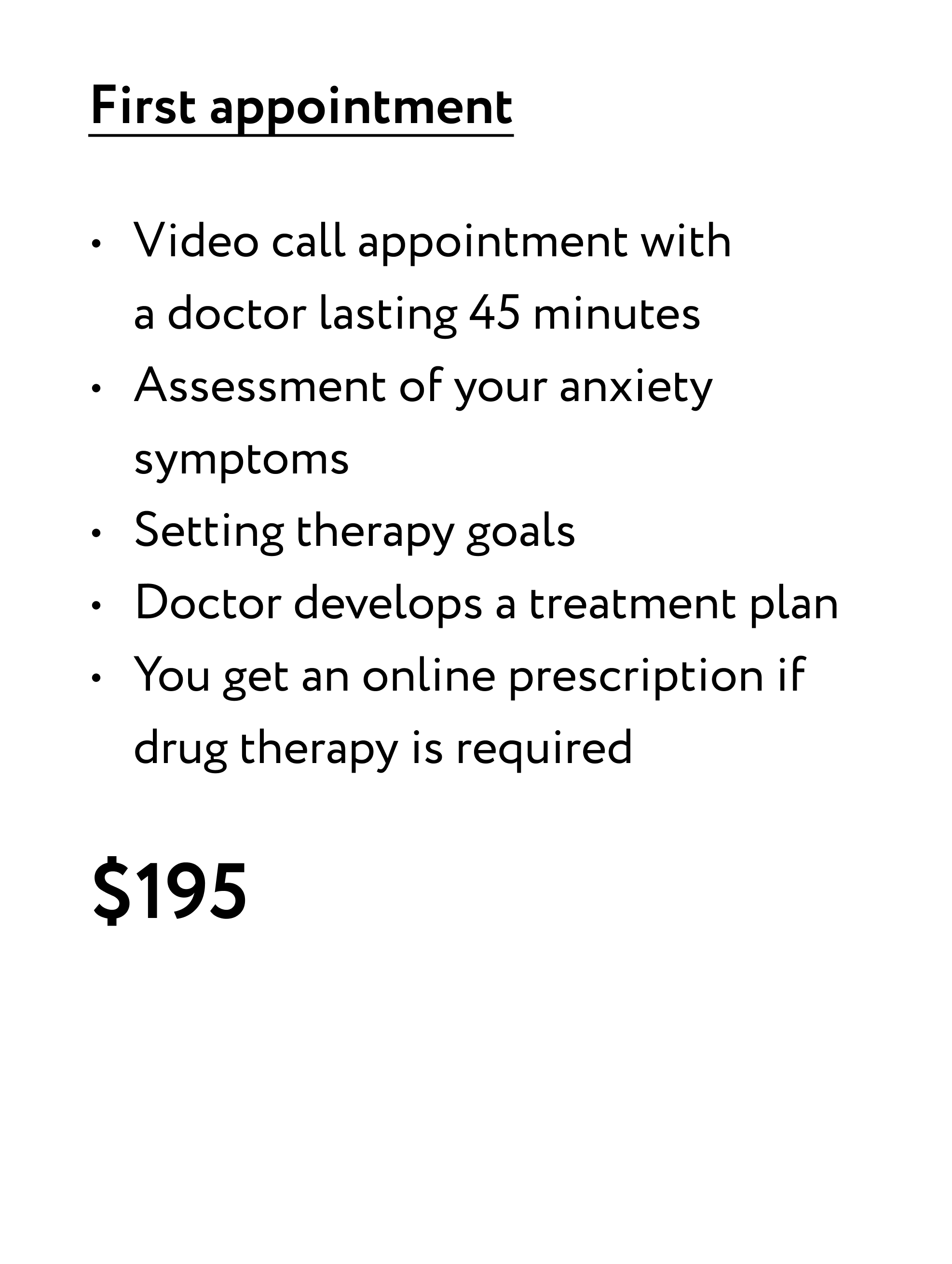 You can choose the pace and number of meetings with your therapist to discuss your progress and concerns, talk therapy, learn self-help techniques, etc. If you need drugs for your anxiety management, your therapist will give you prescriptions for fill-ins delivered to the pharmacy of your choice for your maximum convenience.